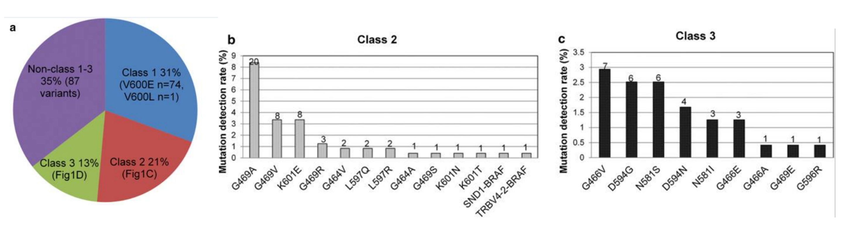 根據(jù)BRAF變異信號(hào)傳導(dǎo)機(jī)制和激酶活性,可將其分為三種功能類別:不依賴RAS,BRAF 激酶活性強(qiáng),比如V600E/L等(1 類);不依賴 RAS,但靠二聚體形式激活通路,激酶活性比野生型高,比如G469A、K601E等(2類);以及依賴RAS ,激酶失活的異二聚體變異(3 類)[4]。