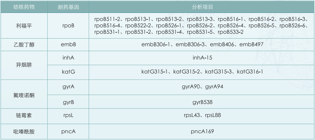 準(zhǔn)確鑒定臨床常見結(jié)核分枝桿菌常見的耐藥基因突變位點(diǎn),覆蓋6種抗結(jié)核藥物(利福平、乙胺丁醇、氟喹諾酮、異煙肼、鏈霉素和吡嗪酰胺),可輔助臨床治療結(jié)核病。